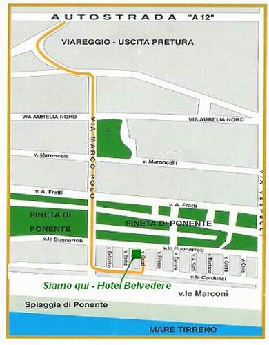 Exit motorway junction A11 or A12 at Viareggio Marco Polo and drive toward the sea. Turn left at the light on the sea road and drive little further till the third street on your left to reach the Hotel Belvedere.